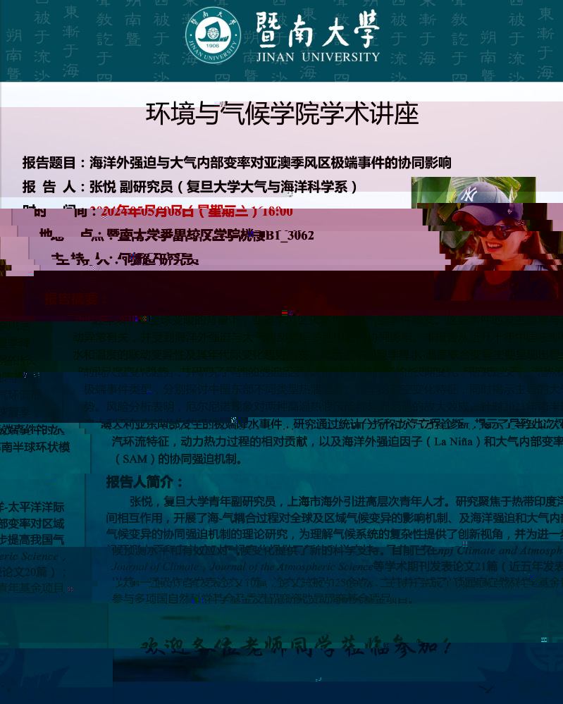 【5月8日講座預告】張悅:海洋外強迫與大氣内部變率對亞澳季風區極端事件的協同影響