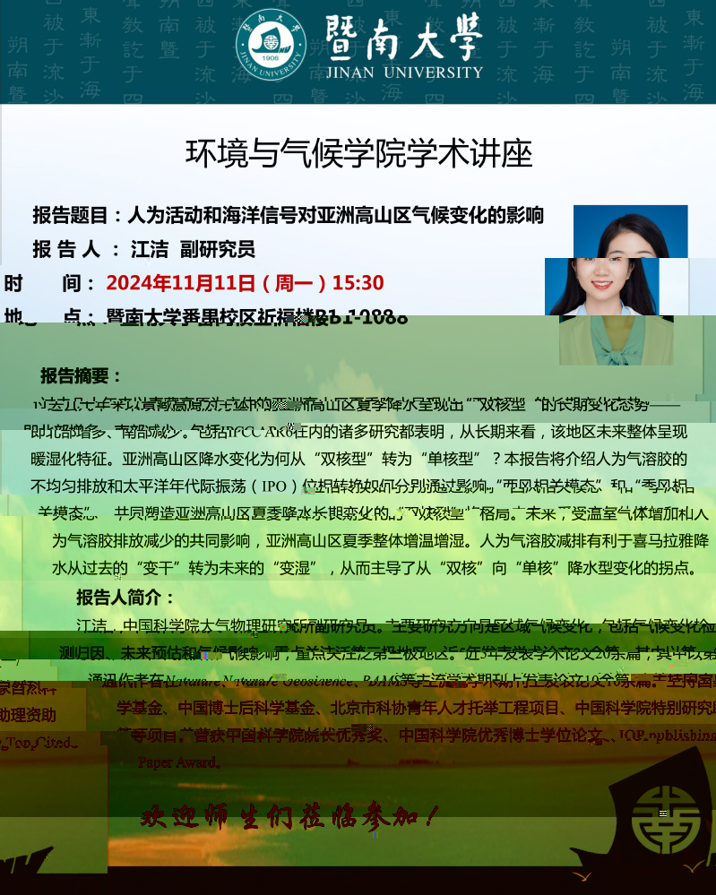 【11月11日講座預告】江潔:人為活動和海洋信号對亞洲高山區氣候變化的影響