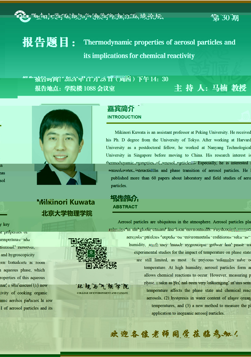 【珠江環境論壇第30期】Mikinori Kuwata:Thermodynamic properties of aerosol particles and its implications for chemical reactivity
